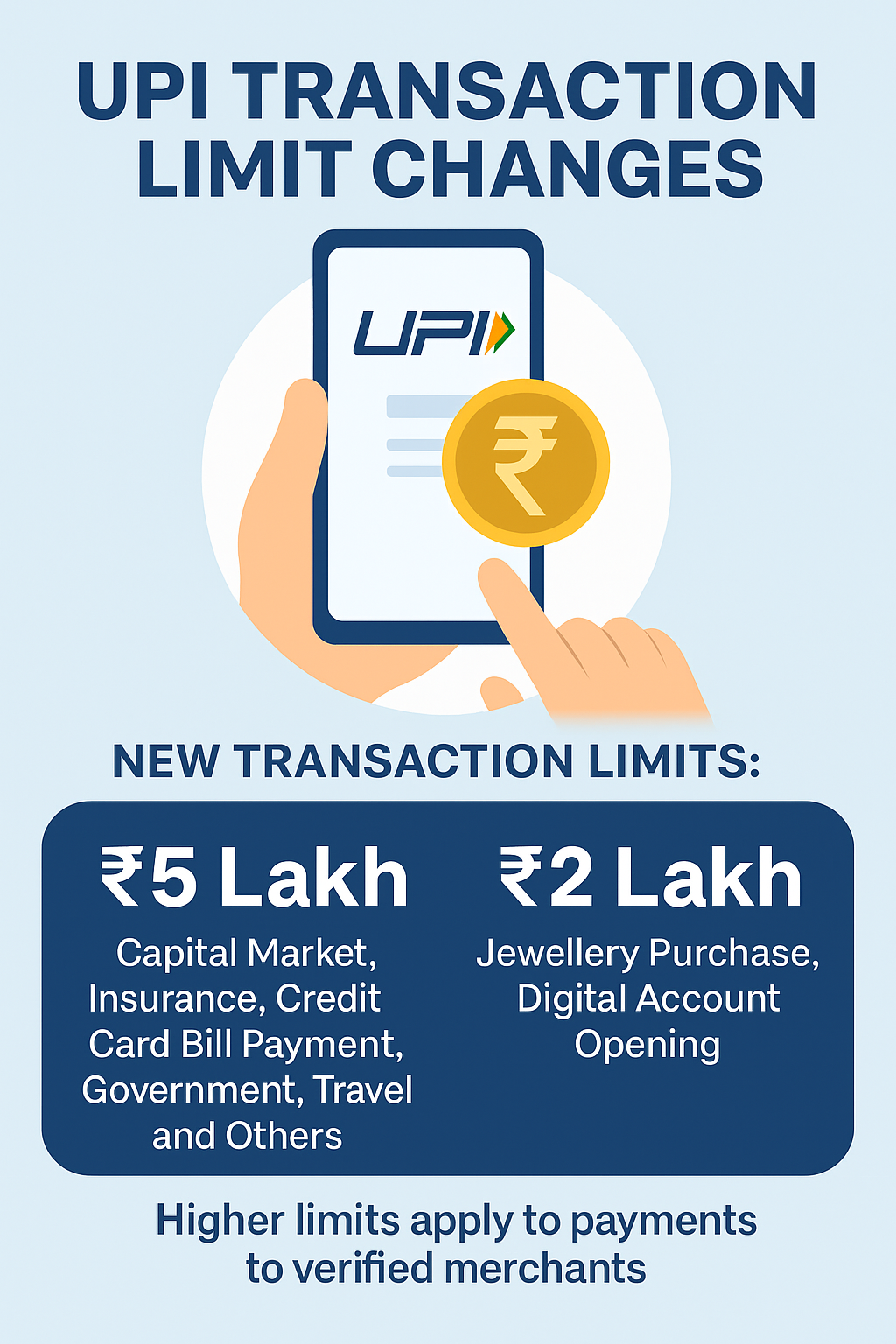 • कैपिटल मार्केट, इंश्योरेंस, गवर्नमेंट ई-मार्केटप्लेस, ट्रैवल, क्रेडिट कार्ड बिल, मर्चेंट पेमेंट → अब एक बार में ₹5 लाख तक का ट्रांजेक्शन