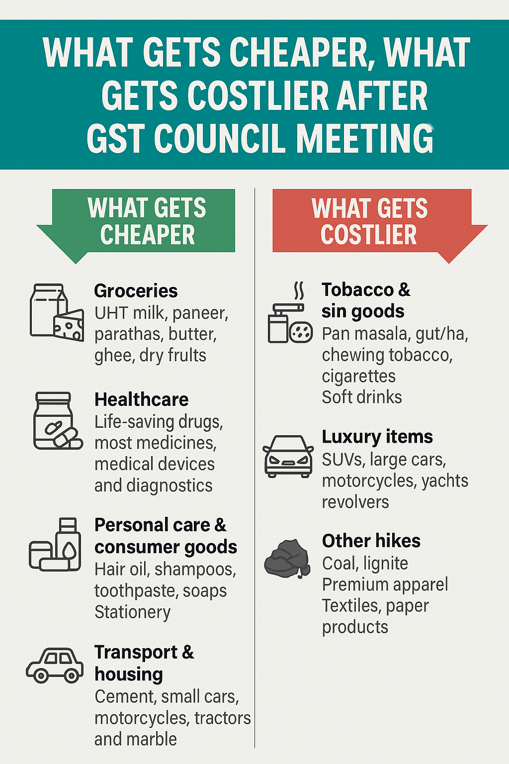 GST काउंसिल की 56वीं बैठक में कई बड़े टैक्स सुधार किए गए। इस मीटिंग के बाद रोज़मर्रा के सामान से लेकर कार, सीमेंट, दवाइयां और कंज्यूमर गुड्स तक की कीमतों में बड़ा बदलाव देखने को मिलेगा। जहां एक तरफ आवश्यक वस्तुएं और छोटे वाहन सस्ते होंगे, वहीं लक्ज़री प्रोडक्ट्स और ‘सिन गुड्स’ (तंबाकू, गुटखा, फिज़ी ड्रिंक्स) और भी महंगे हो जाएंगे।