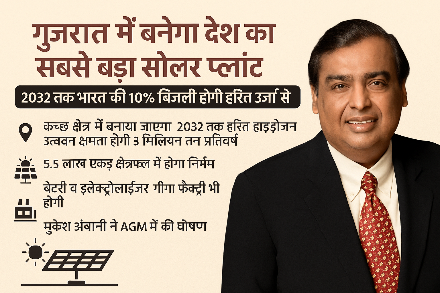 रिलायंस इंडस्ट्रीज लिमिटेड (RIL) के चेयरमैन मुकेश अंबानी ने कंपनी की वार्षिक आम बैठक (AGM) में एक बड़ा ऐलान किया है। उन्होंने कहा कि गुजरात के कच्छ क्षेत्र में दुनिया के सबसे बड़े सिंगल-साइट सोलर प्रोजेक्ट्स में से एक का निर्माण किया जाएगा। इस परियोजना से अगले दशक में भारत की लगभग 10% बिजली की ज़रूरत पूरी हो सकेगी।